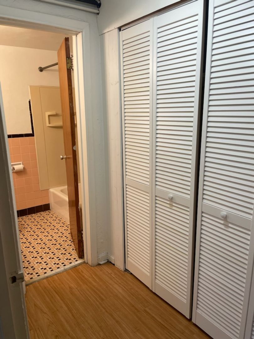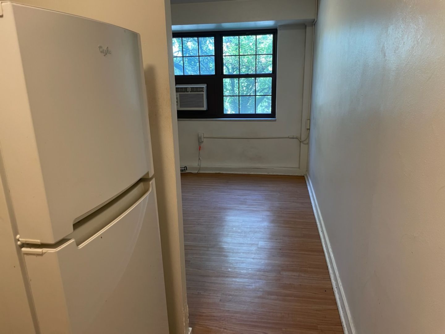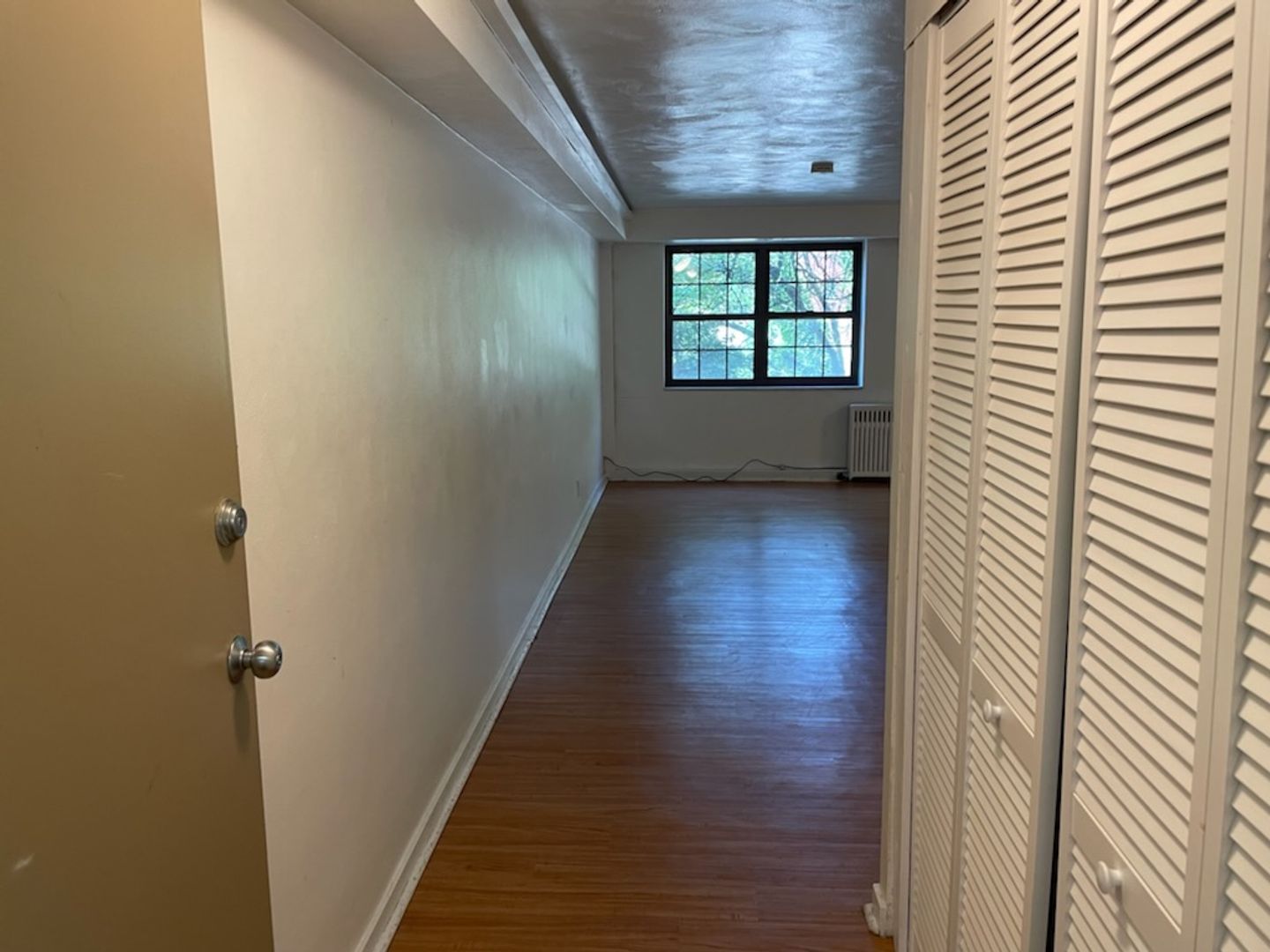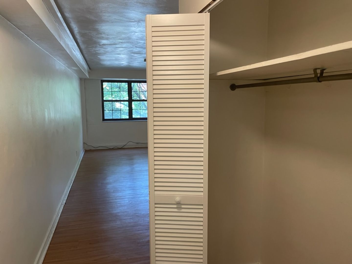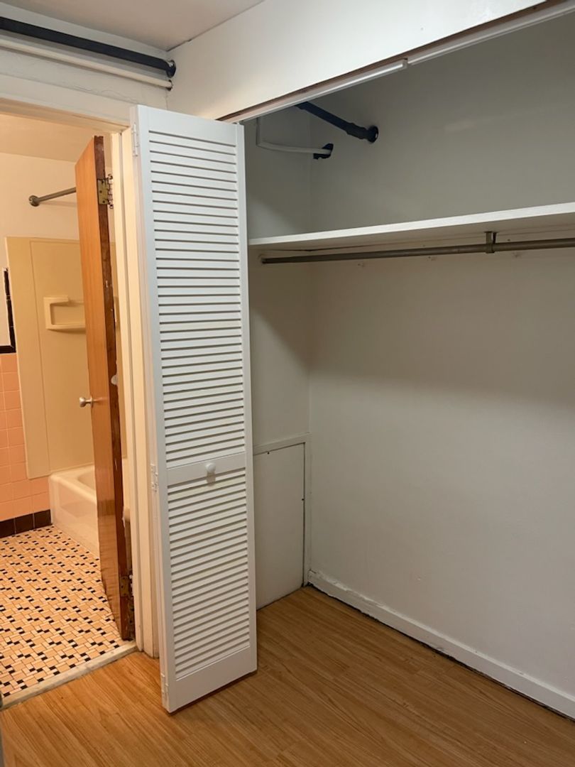 This studio apartment features beautiful hardwood floors and plenty of room for storage.