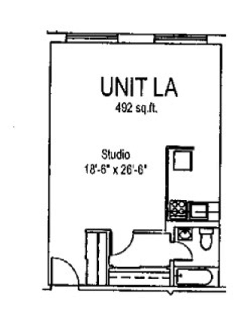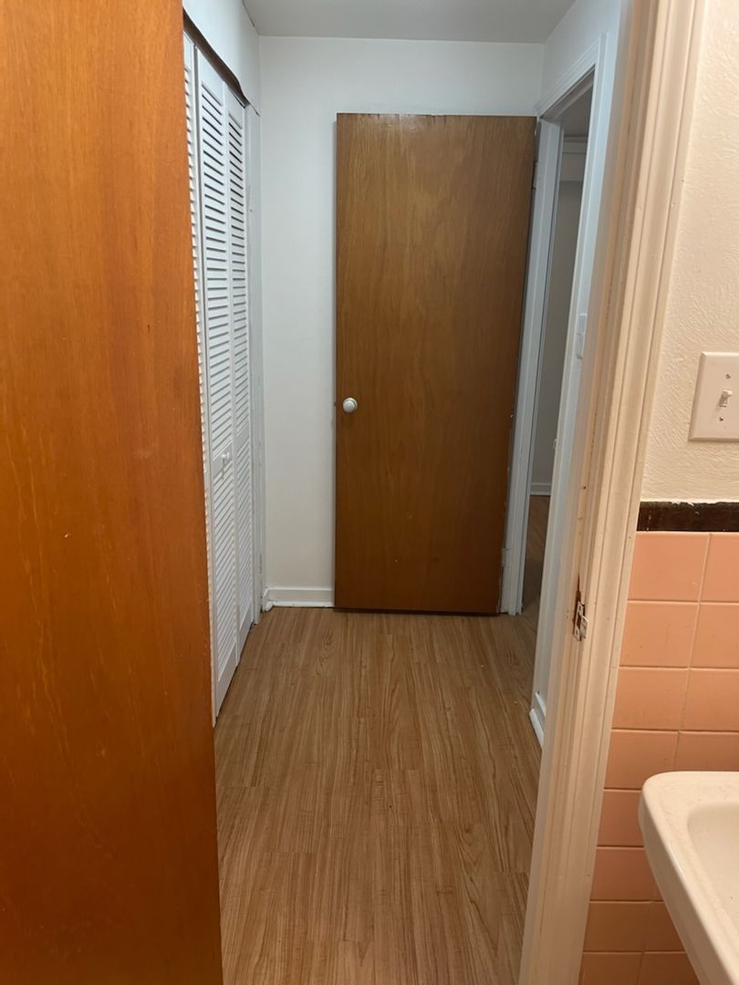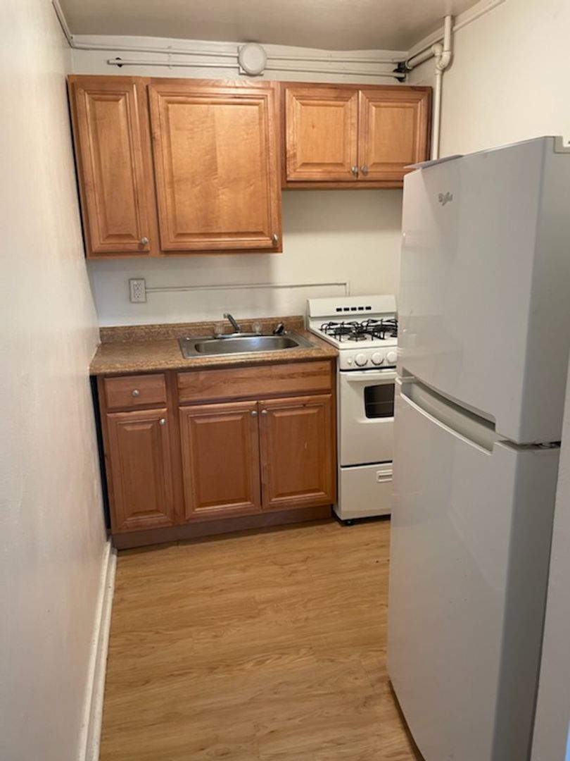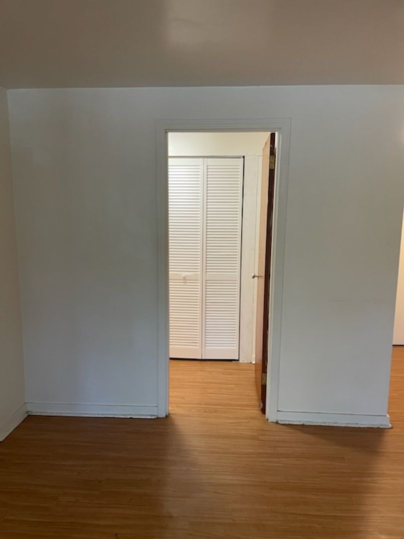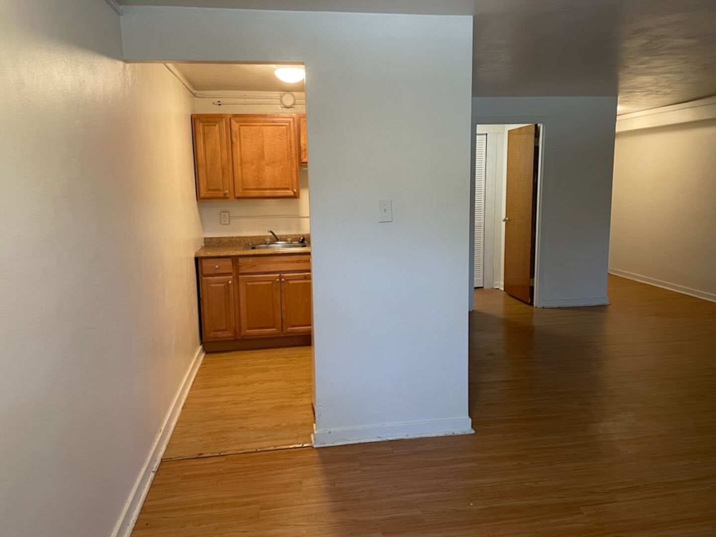 This studio apartment features beautiful hardwood floors and plenty of room for storage.