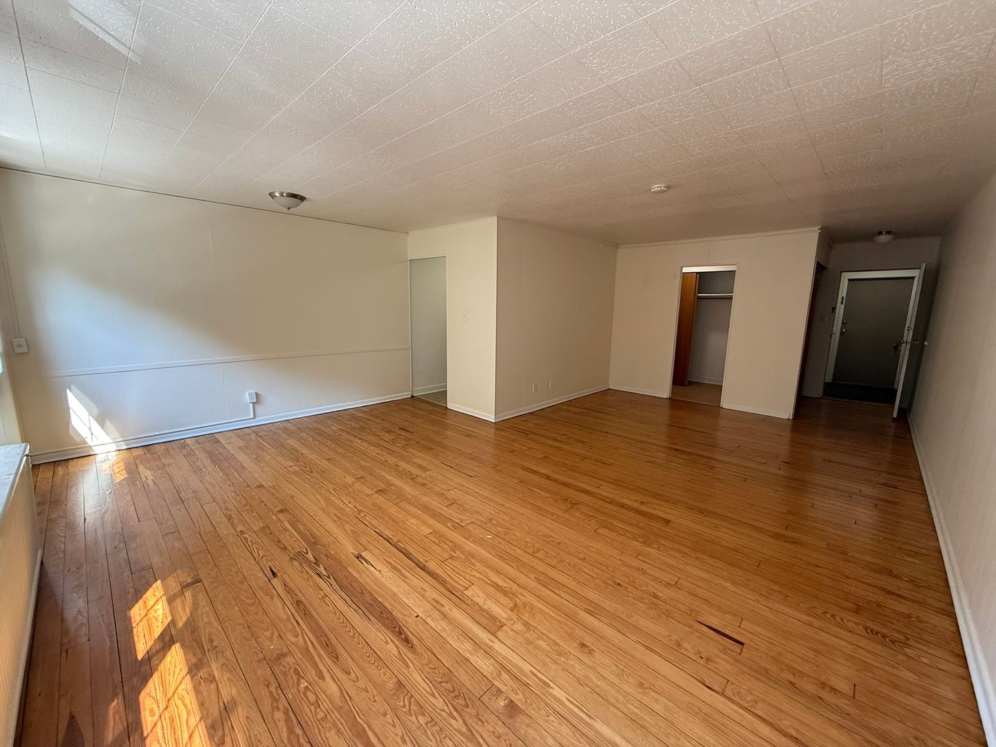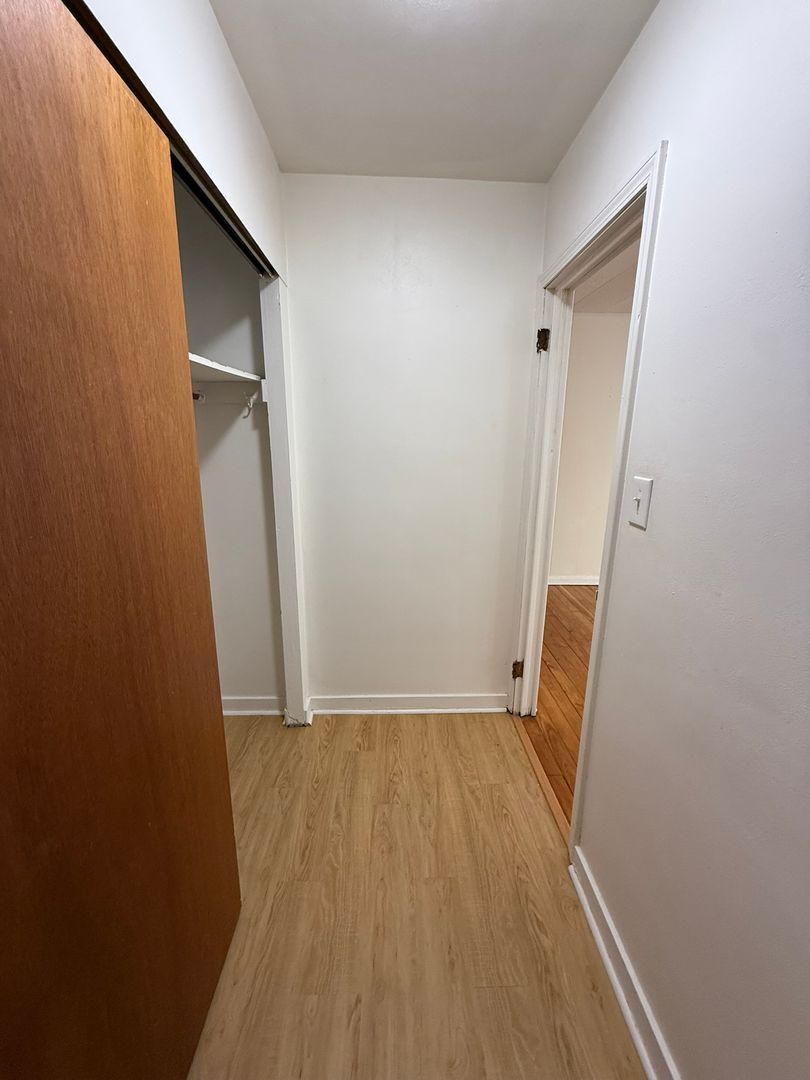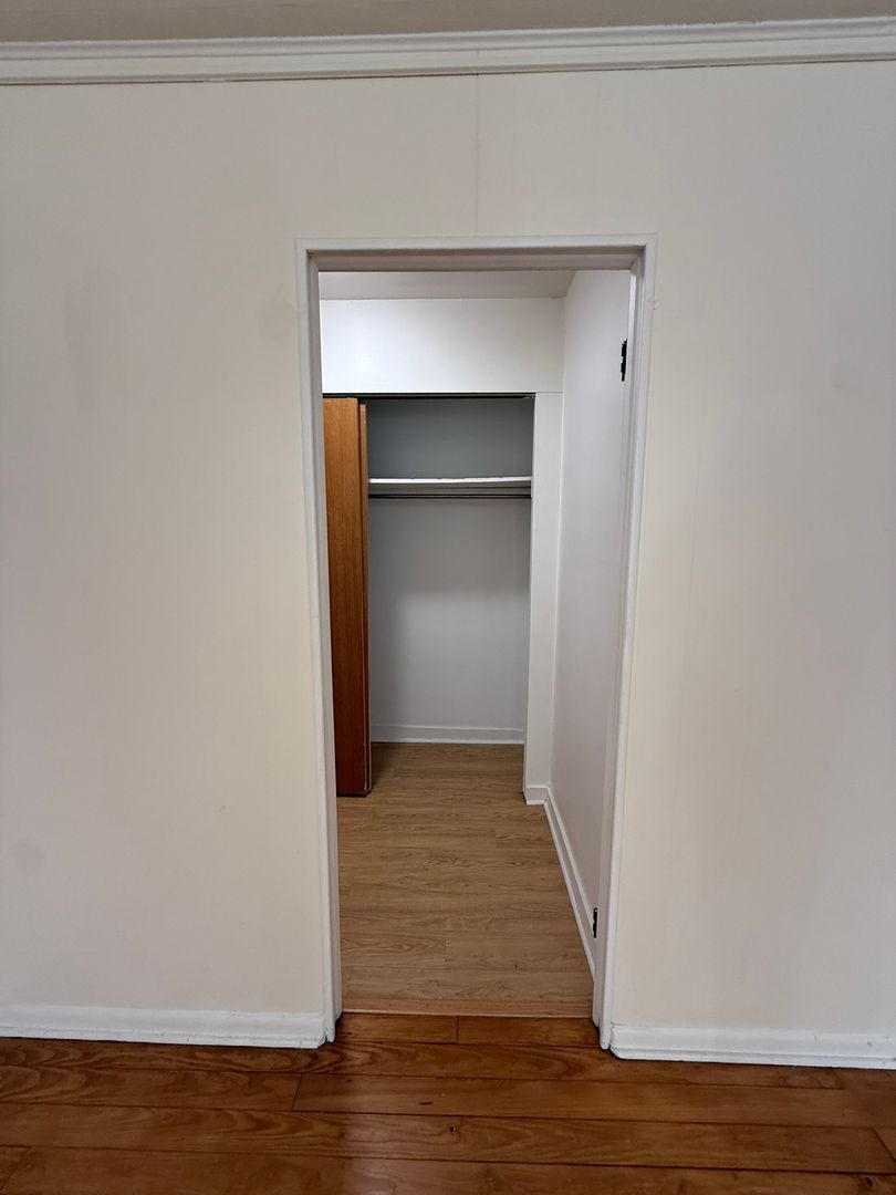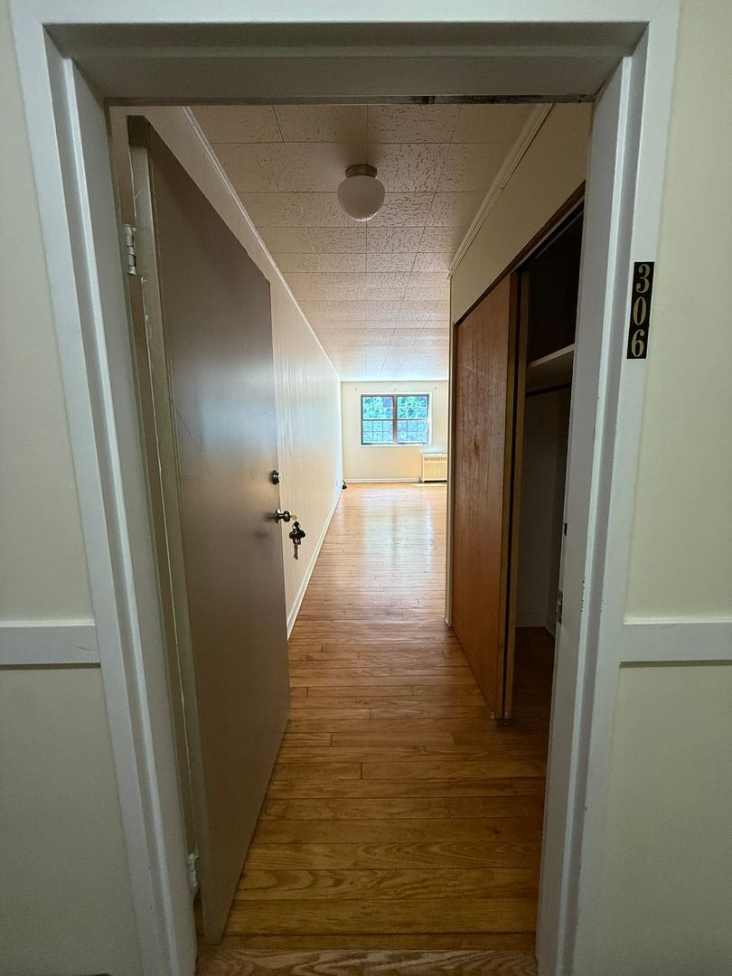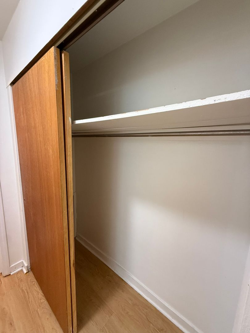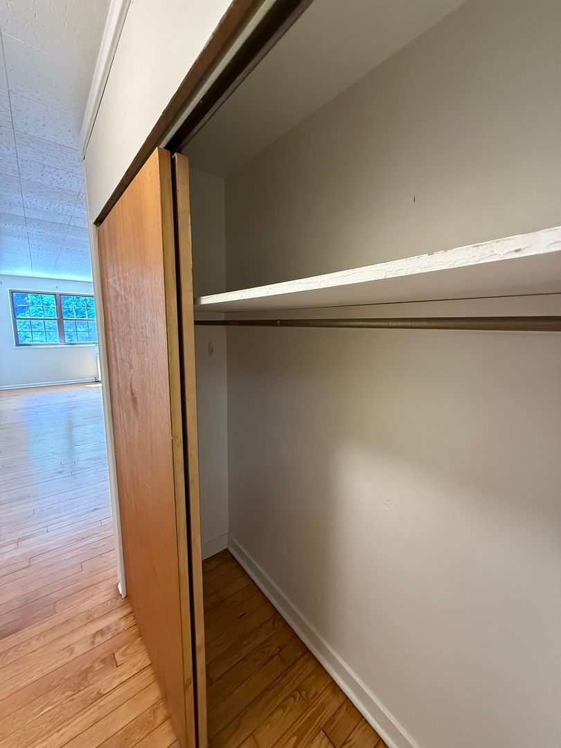 This studio apartment features beautiful hardwood floors and plenty of room for storage.