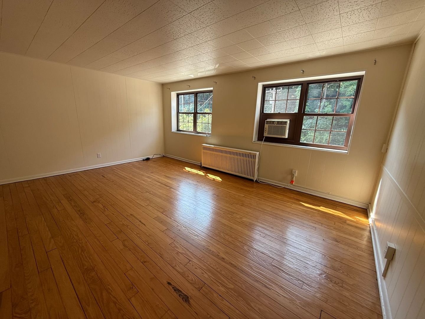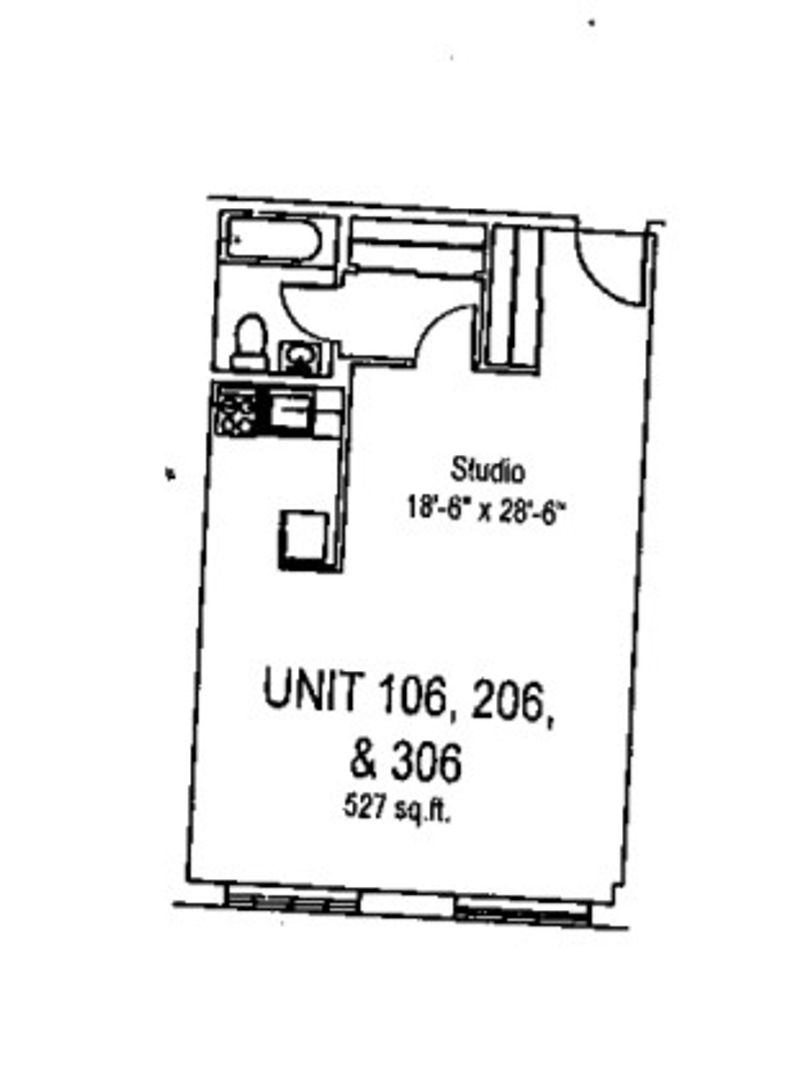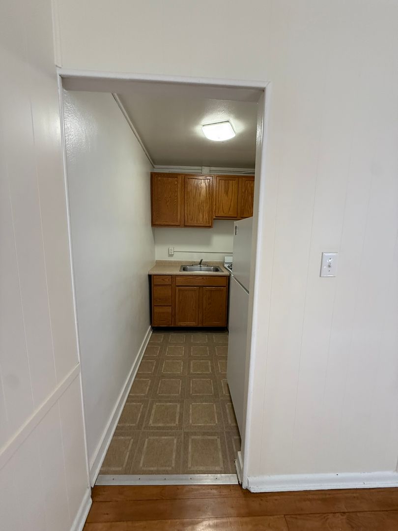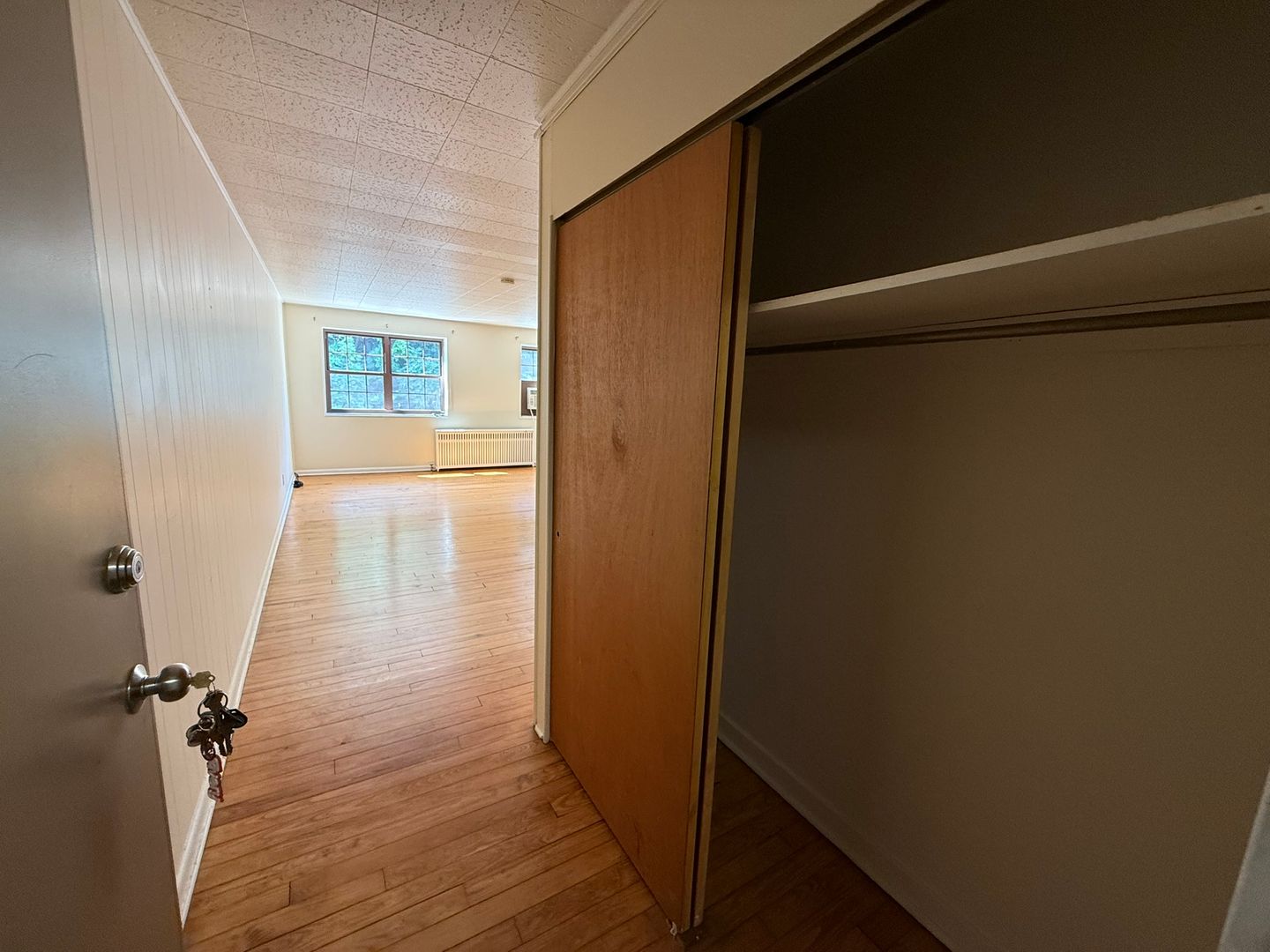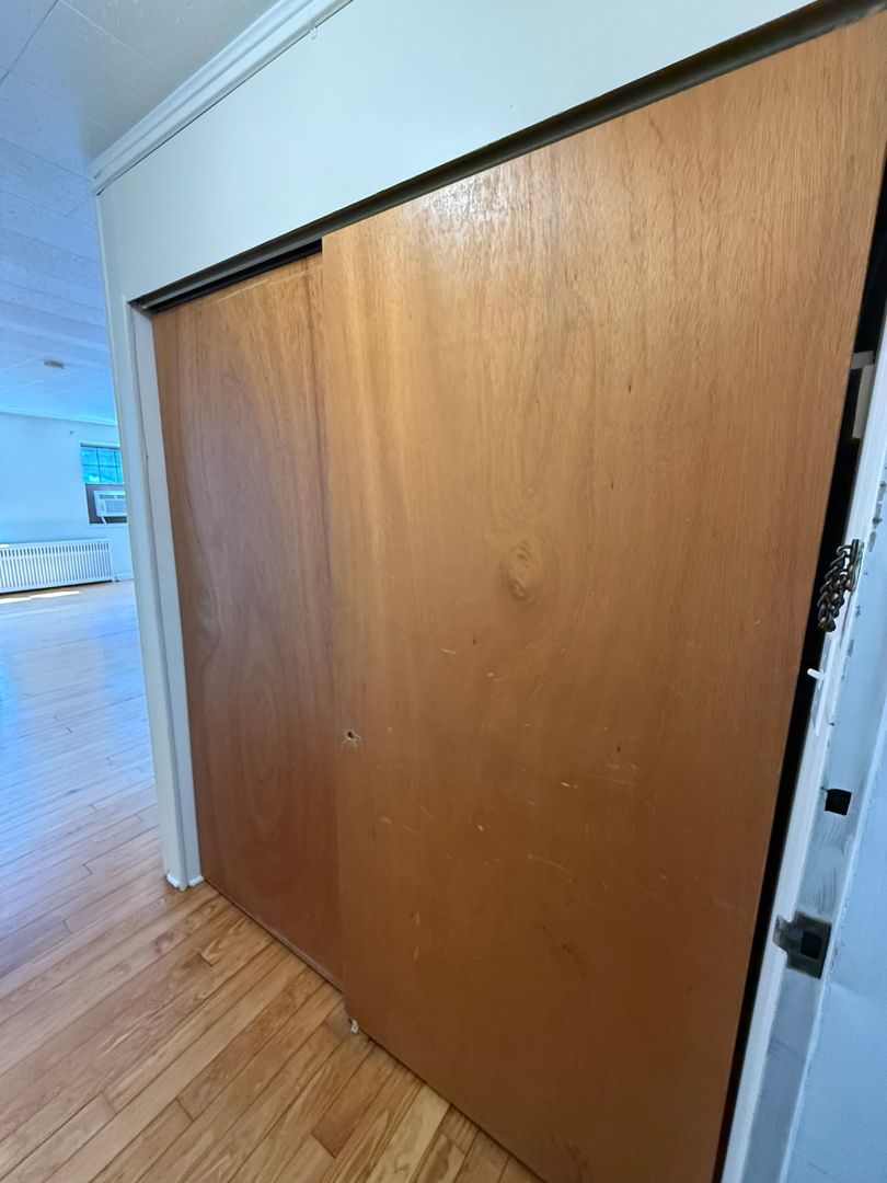 This studio apartment features beautiful hardwood floors and plenty of room for storage.