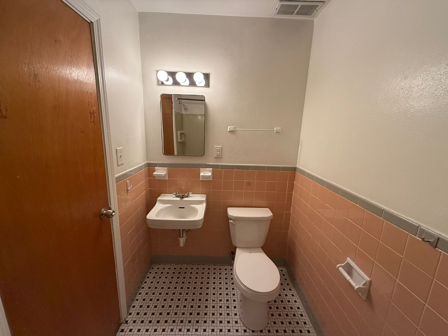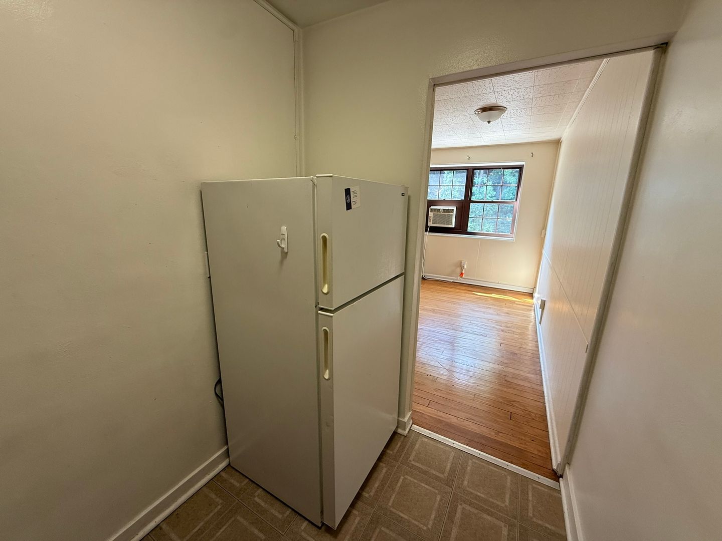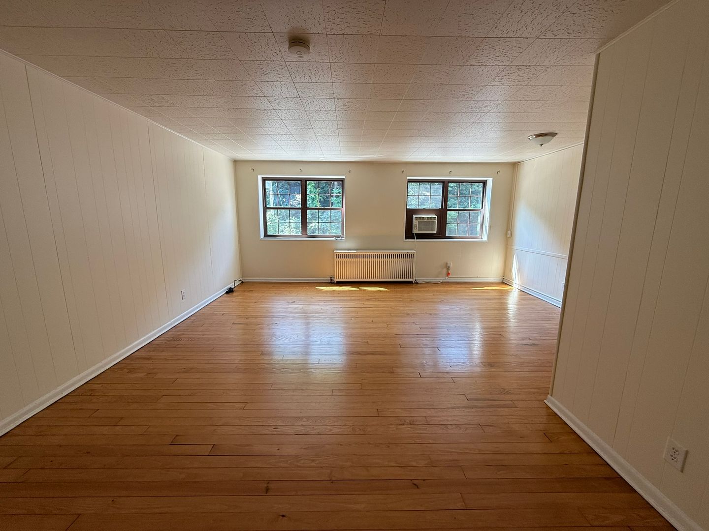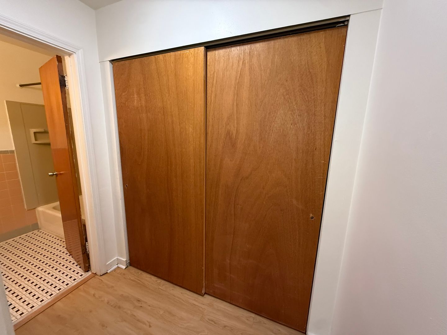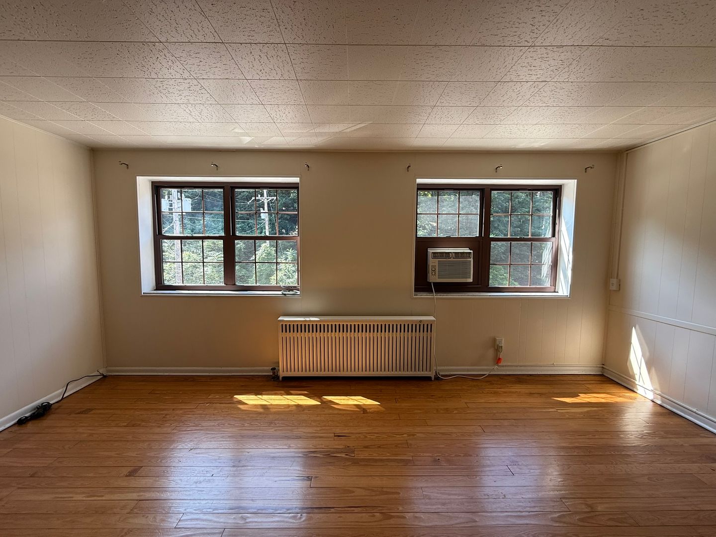 This studio apartment features beautiful hardwood floors and plenty of room for storage.