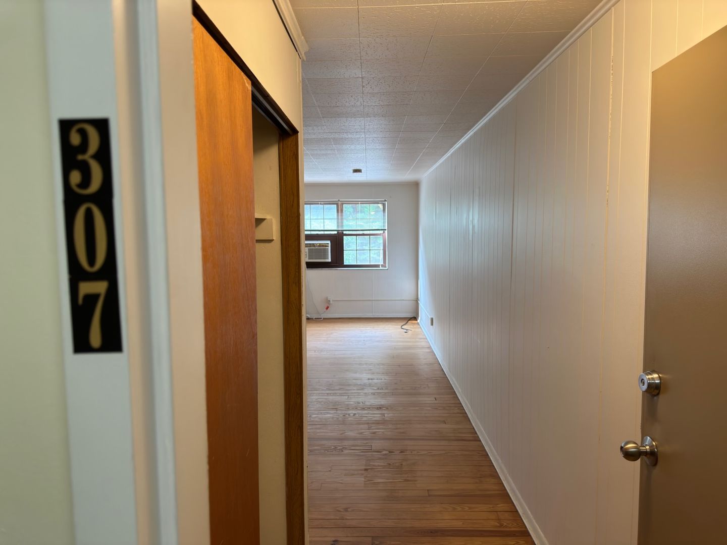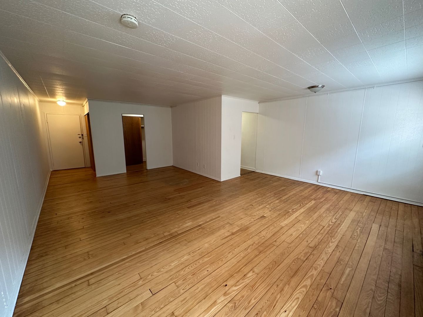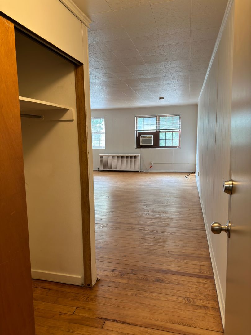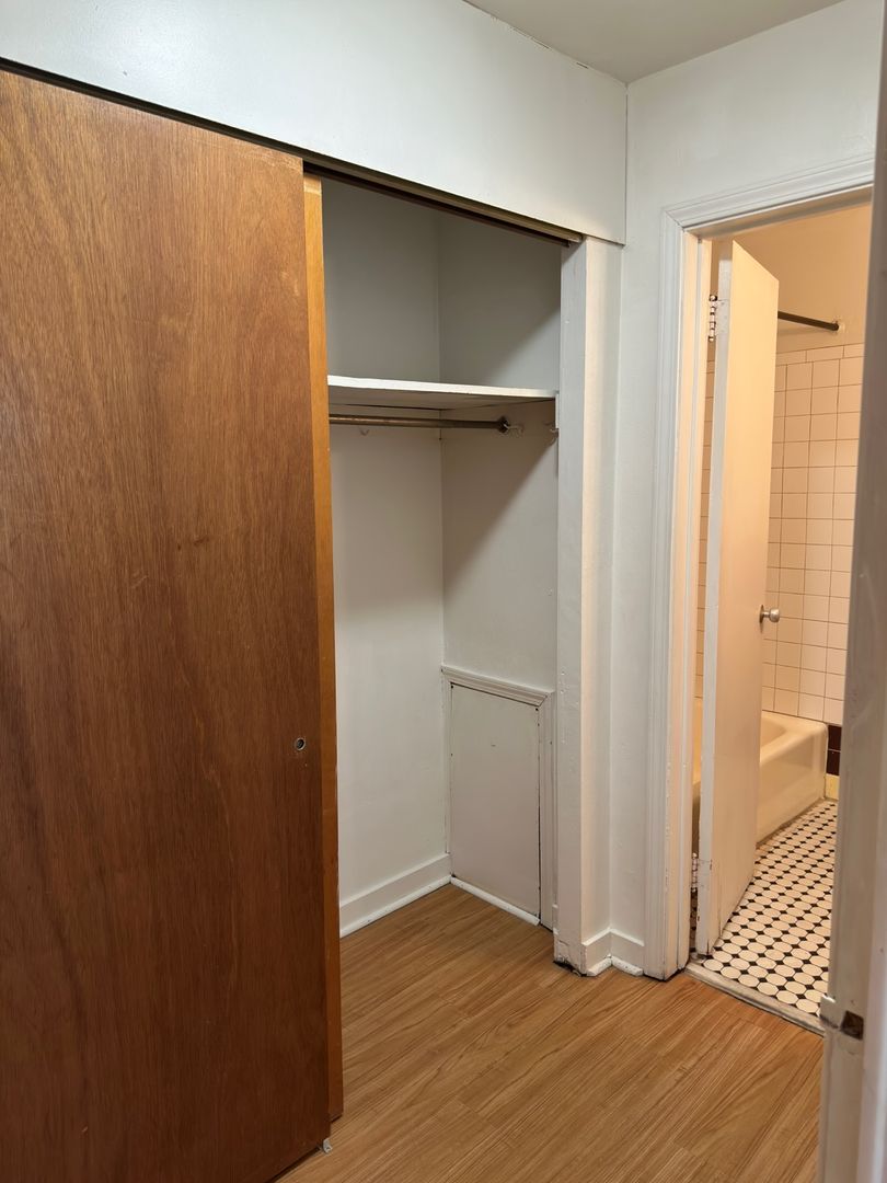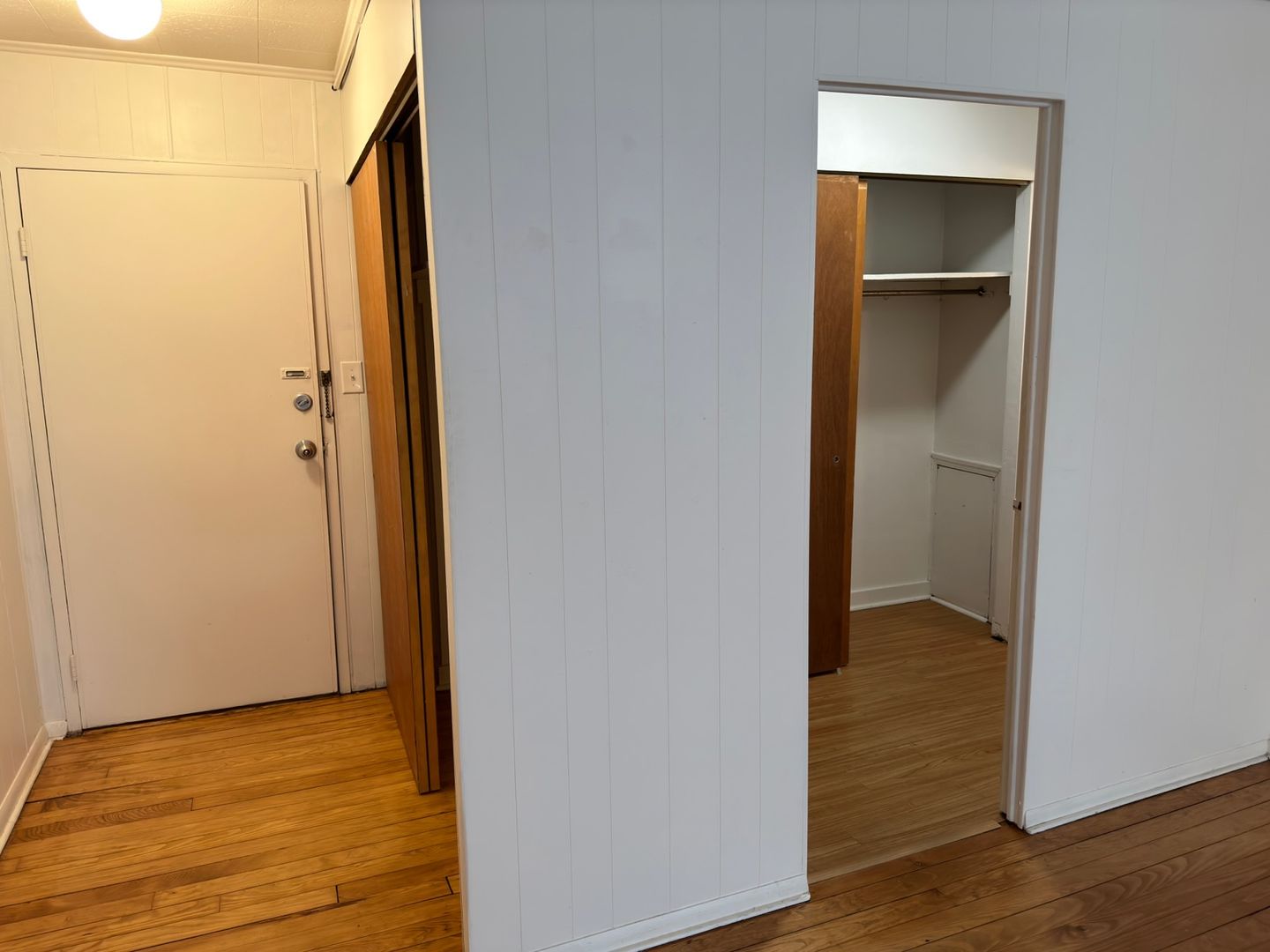 This studio apartment features beautiful hardwood floors and plenty of room for storage.