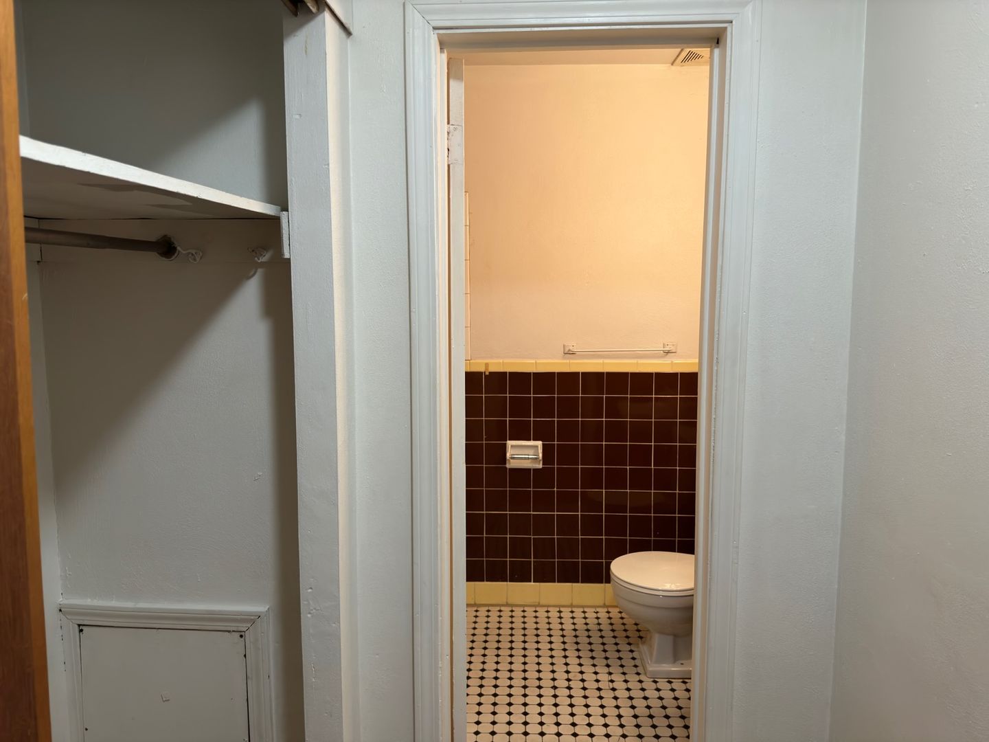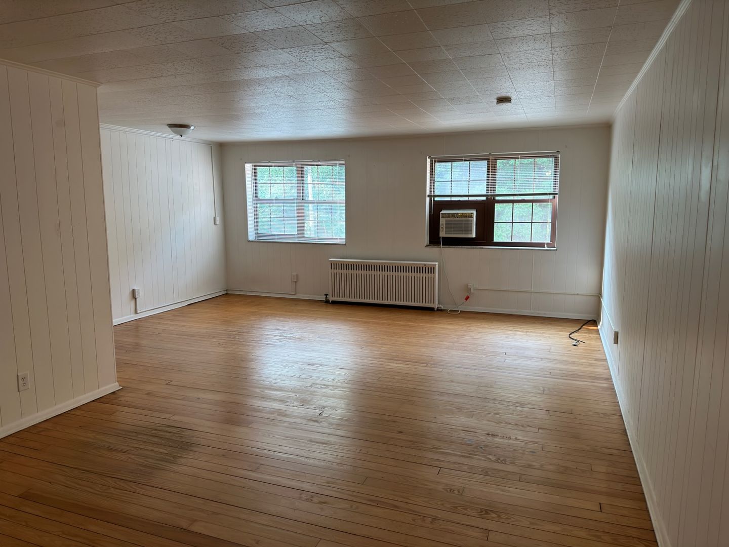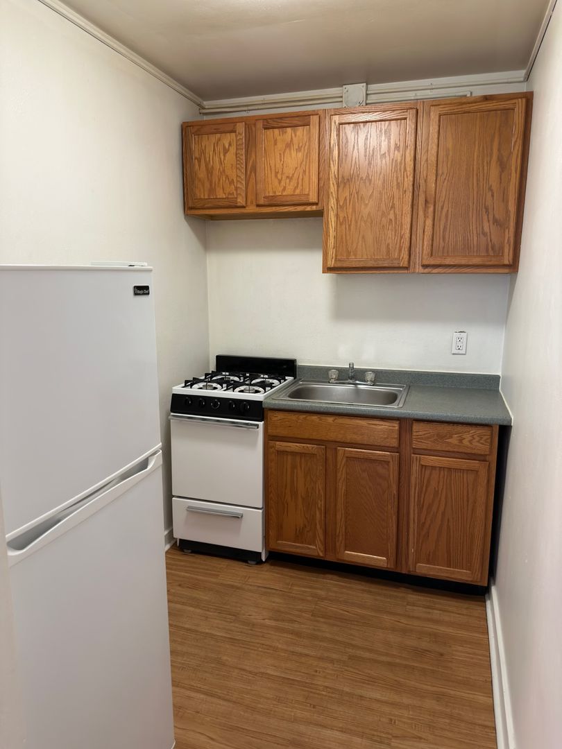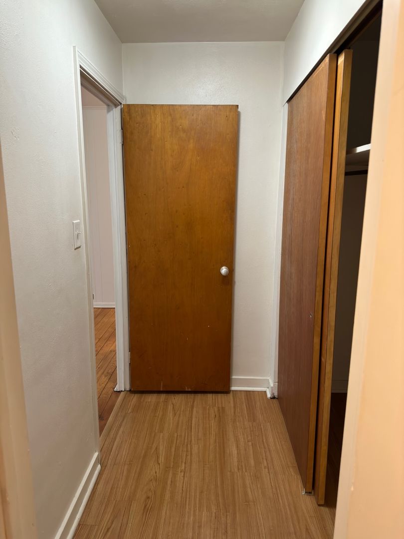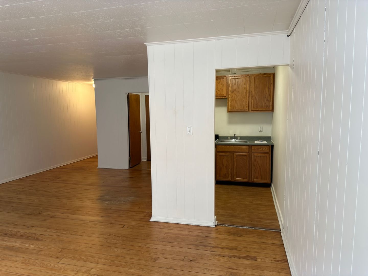 This studio apartment features beautiful hardwood floors and plenty of room for storage.