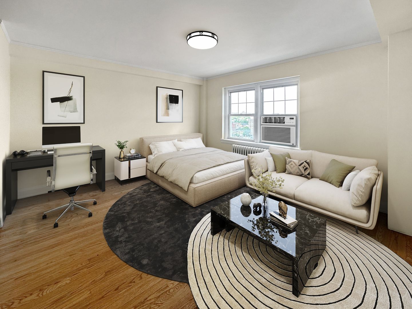 Other amenities include onsite parking for an additional fee, intercom system for tenants, FOB building entry key, an onsite laundry room, passenger and service elevators, and a ready-to-use window air conditioning unit in each apartment.