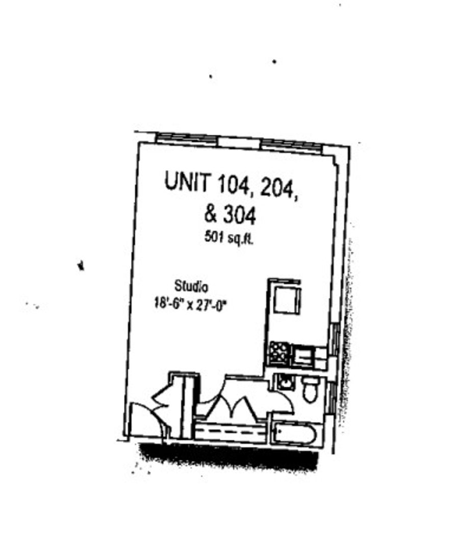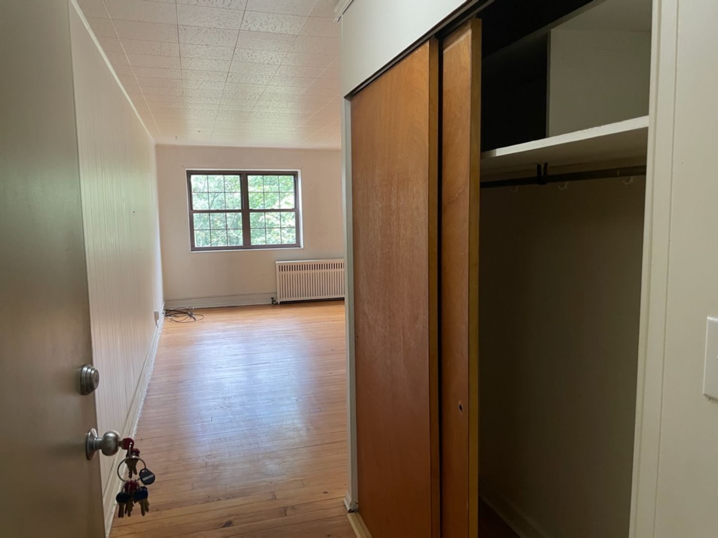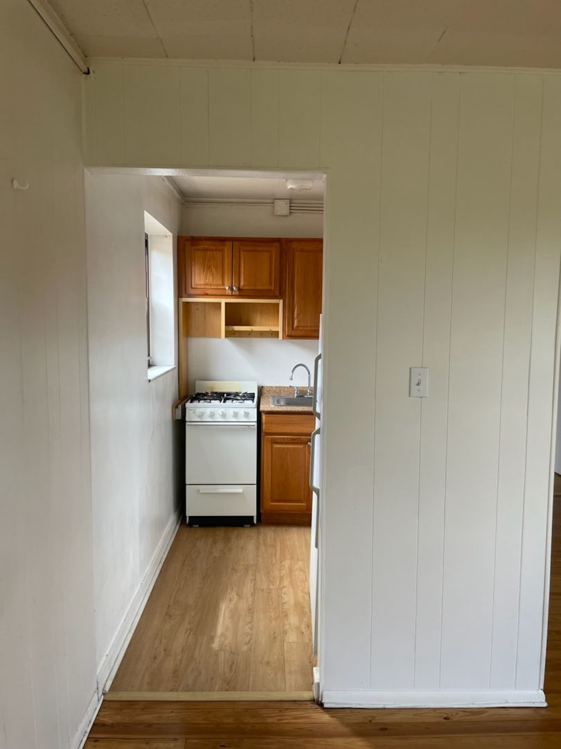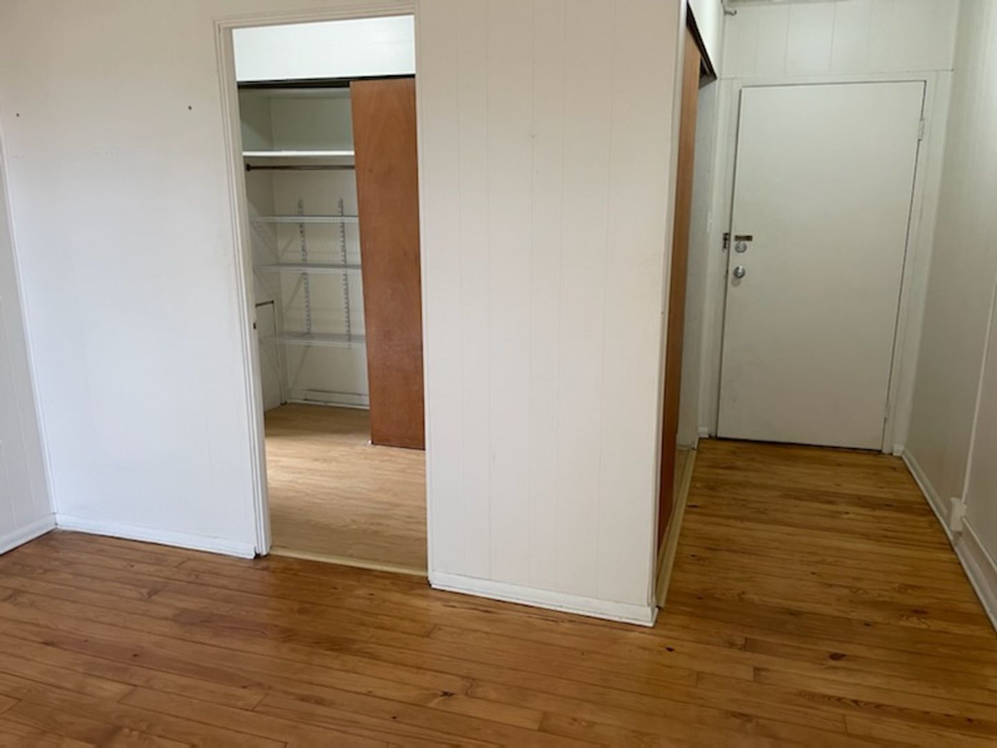 This studio apartment features beautiful hardwood floors and plenty of room for storage.