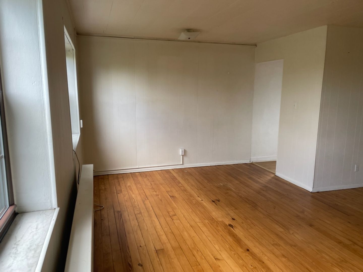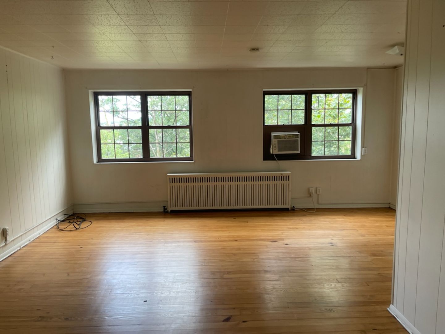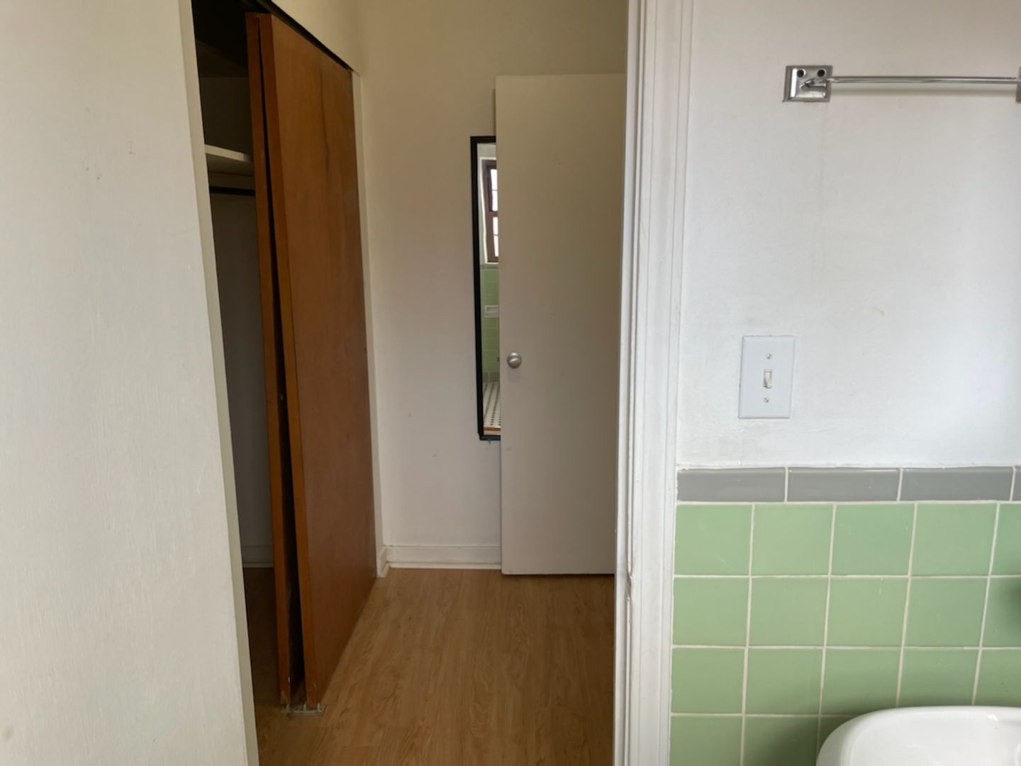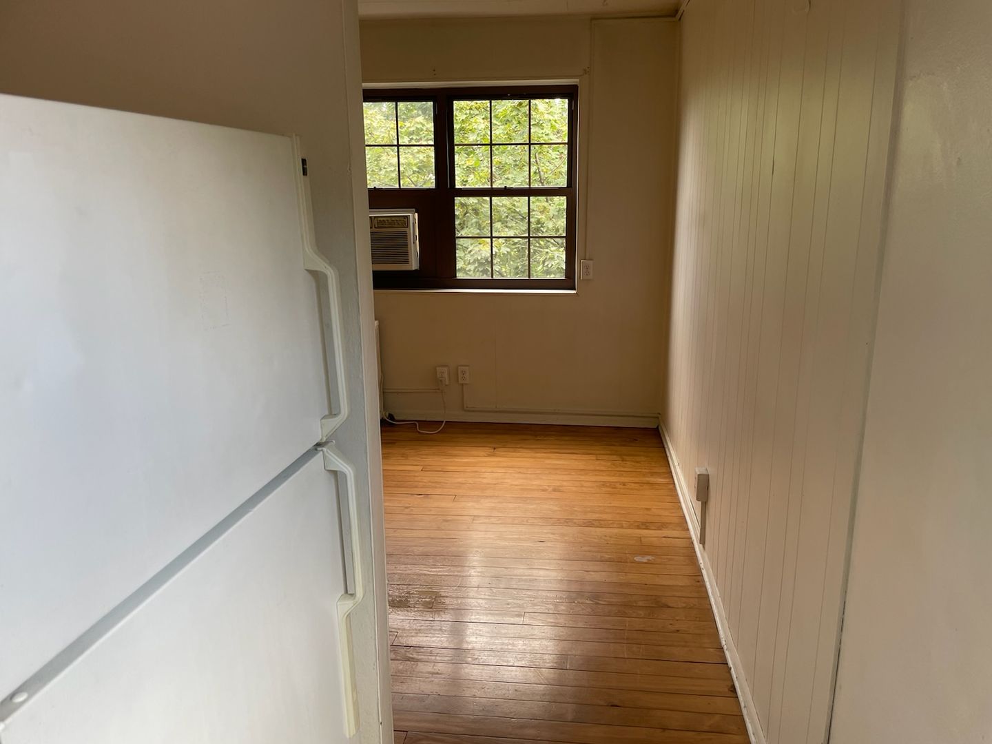 This studio apartment features beautiful hardwood floors and plenty of room for storage.