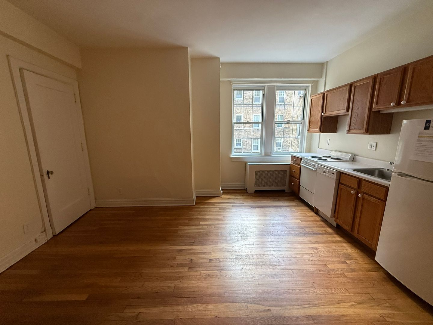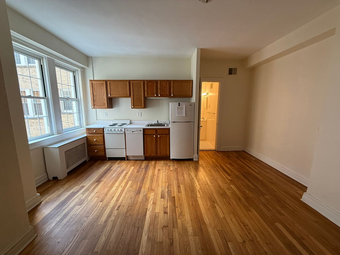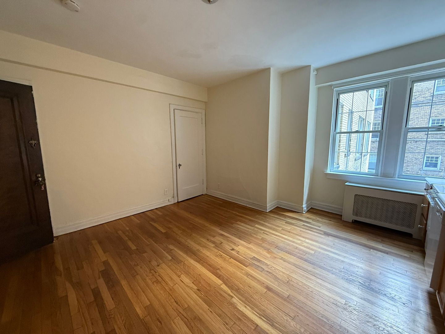 This studio apartment features beautiful hardwood floors and lots of storage.