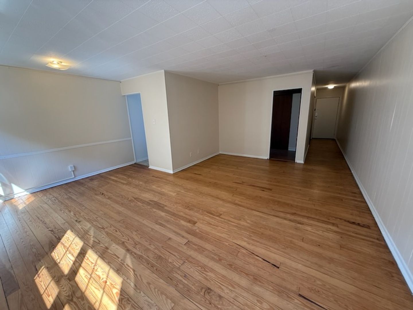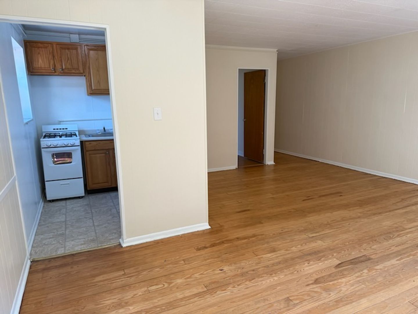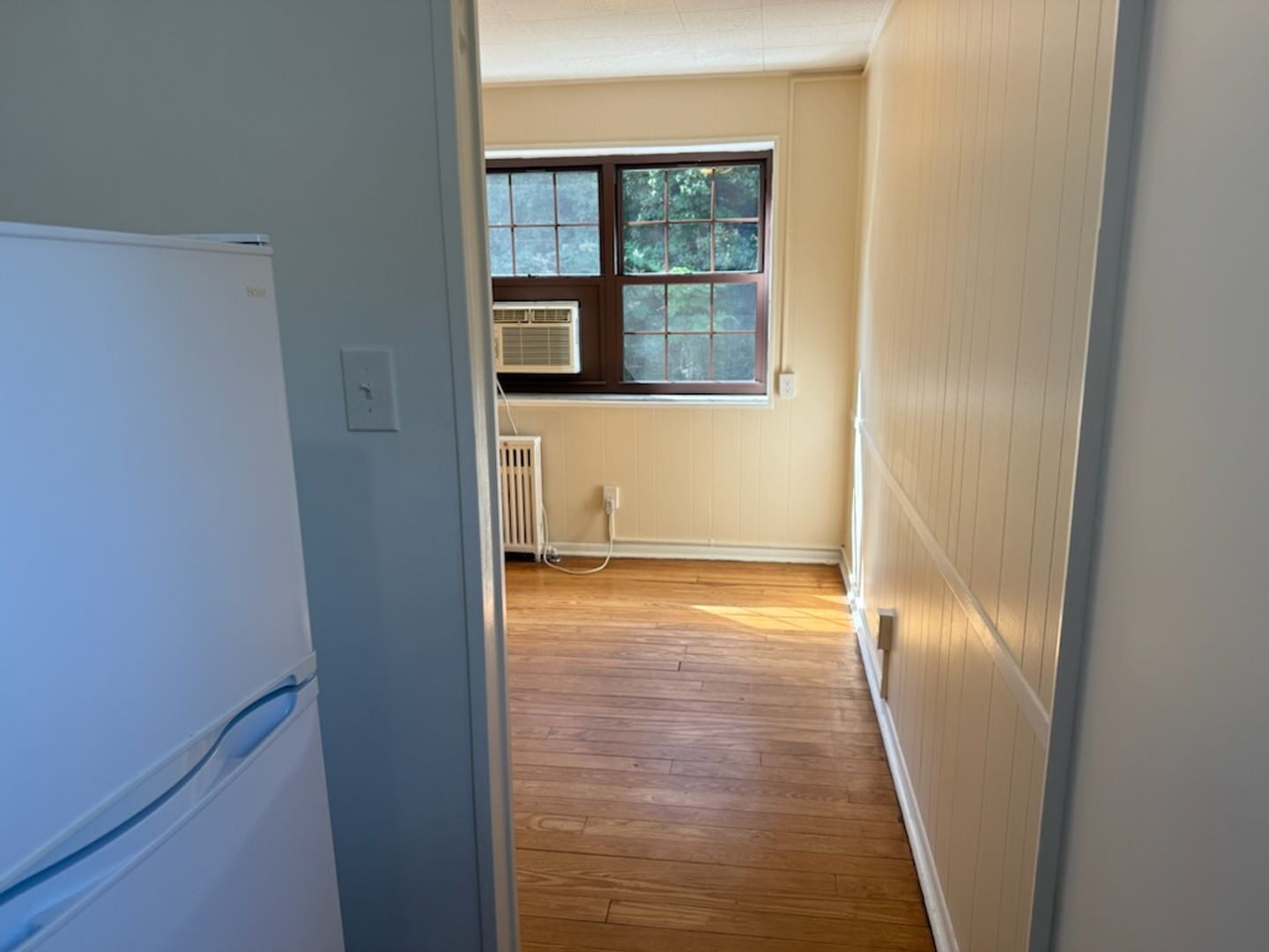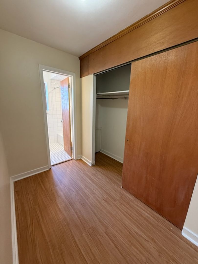 This studio apartment features beautiful hardwood floors and plenty of room for storage.