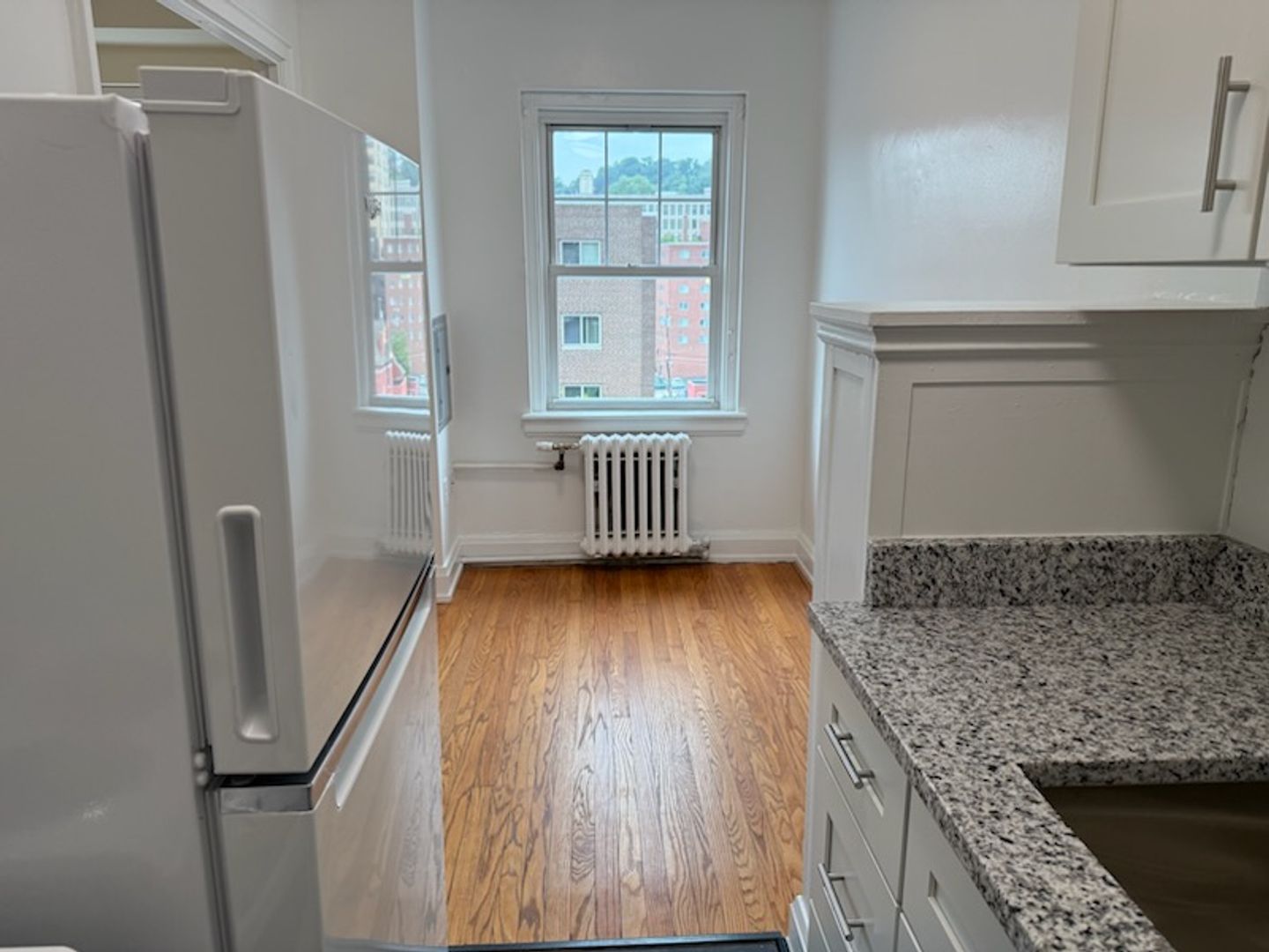 Located just steps away from major universities, UPMC hospitals, popular restaurants, and public transportation, the Wellington Apartments offer both convenience and charm. Our apartments feature contemporary kitchens and bathrooms while preserving historic details like hardwood floors, built-in shelving, and spacious layouts. Kitchens are equipped with granite countertops, white cabinetry, a refrigerator, electric stove/oven, and an exhaust fan. Bathrooms include stylish white tiling, a shower stall, and modern fixtures.