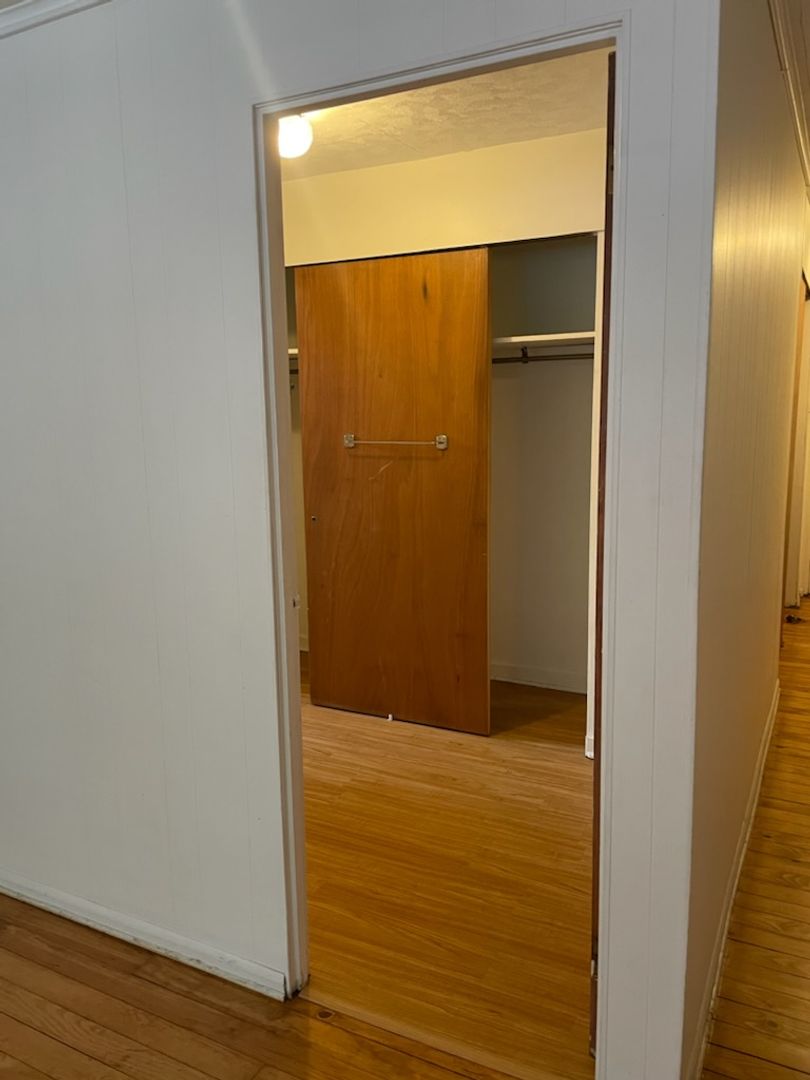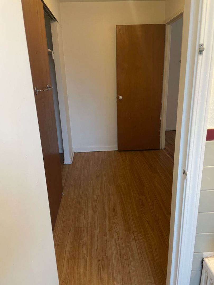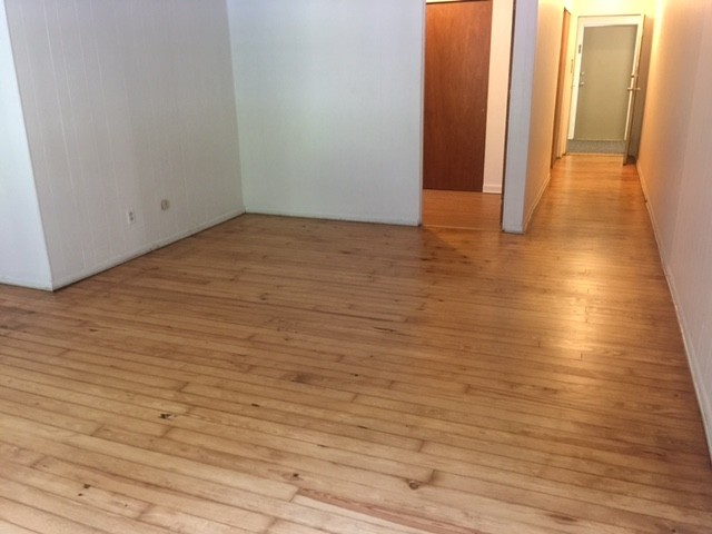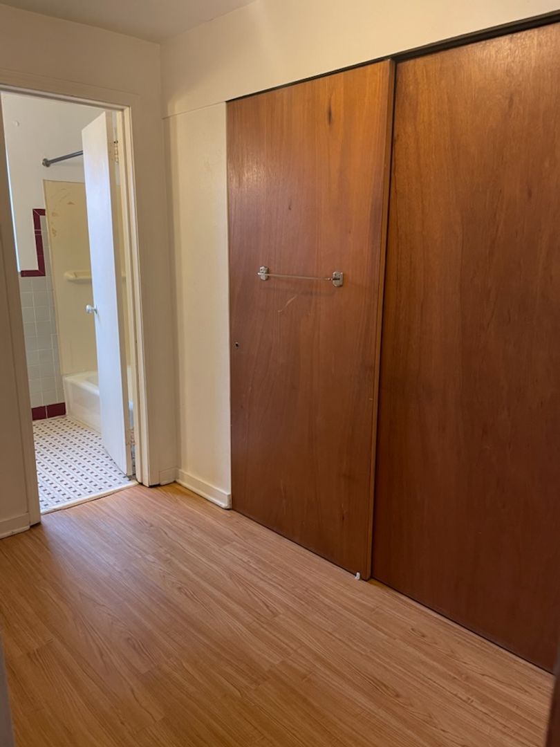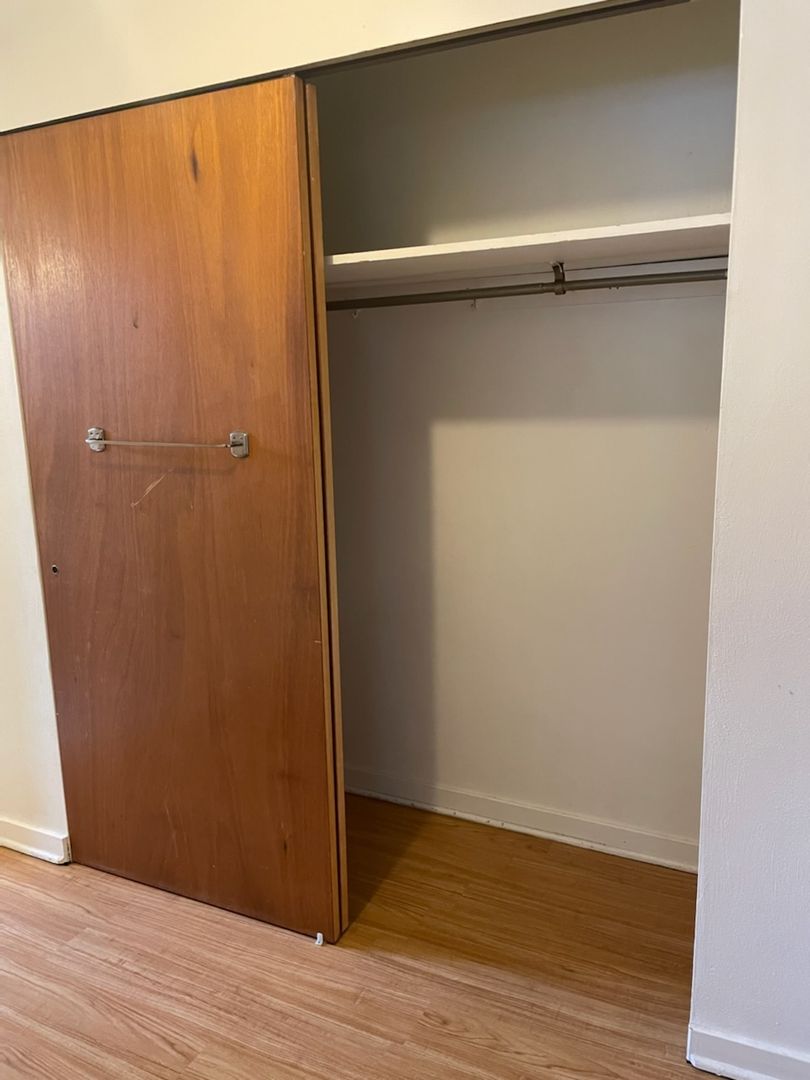 This studio apartment features beautiful hardwood floors and plenty of room for storage.