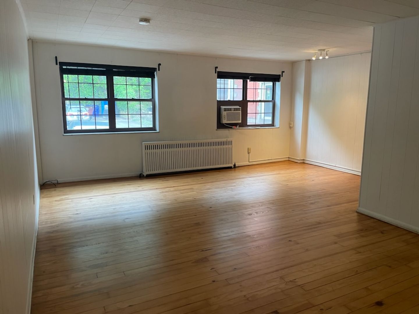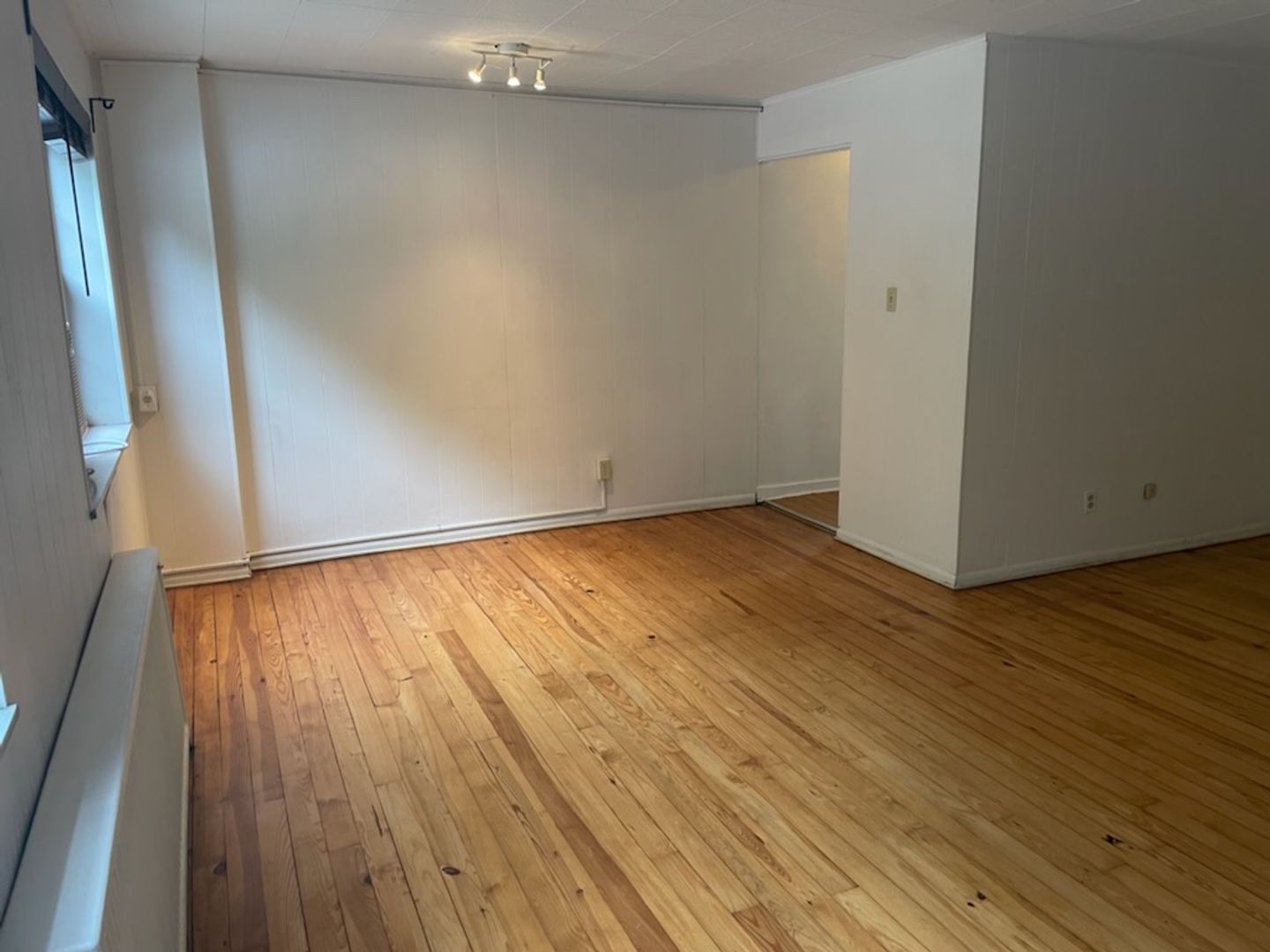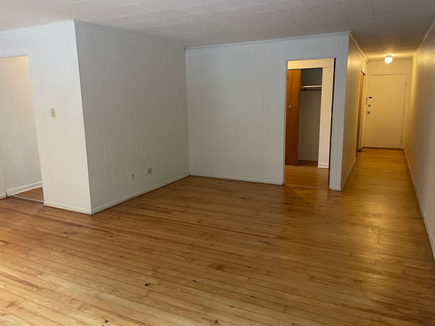 This studio apartment features beautiful hardwood floors and plenty of room for storage.
